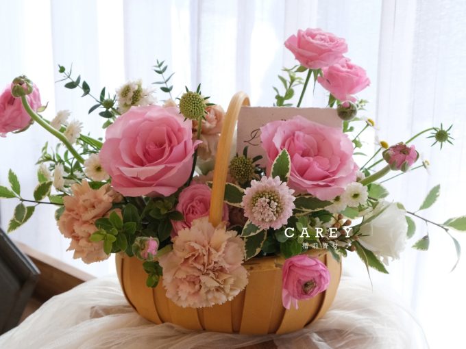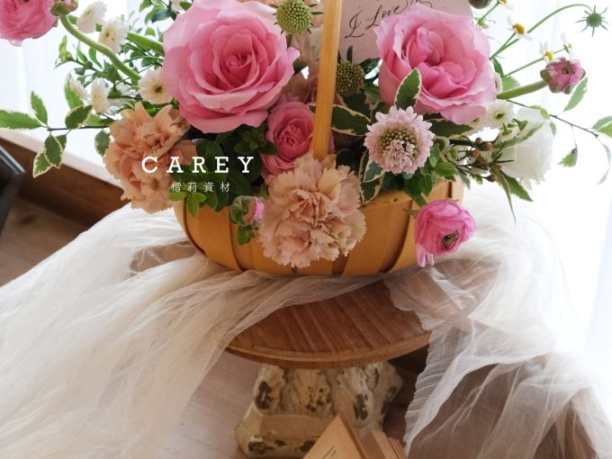 材質是防水塑膠感 但建議海綿還是需要包玻璃紙 淺米色讓花襯起來很美