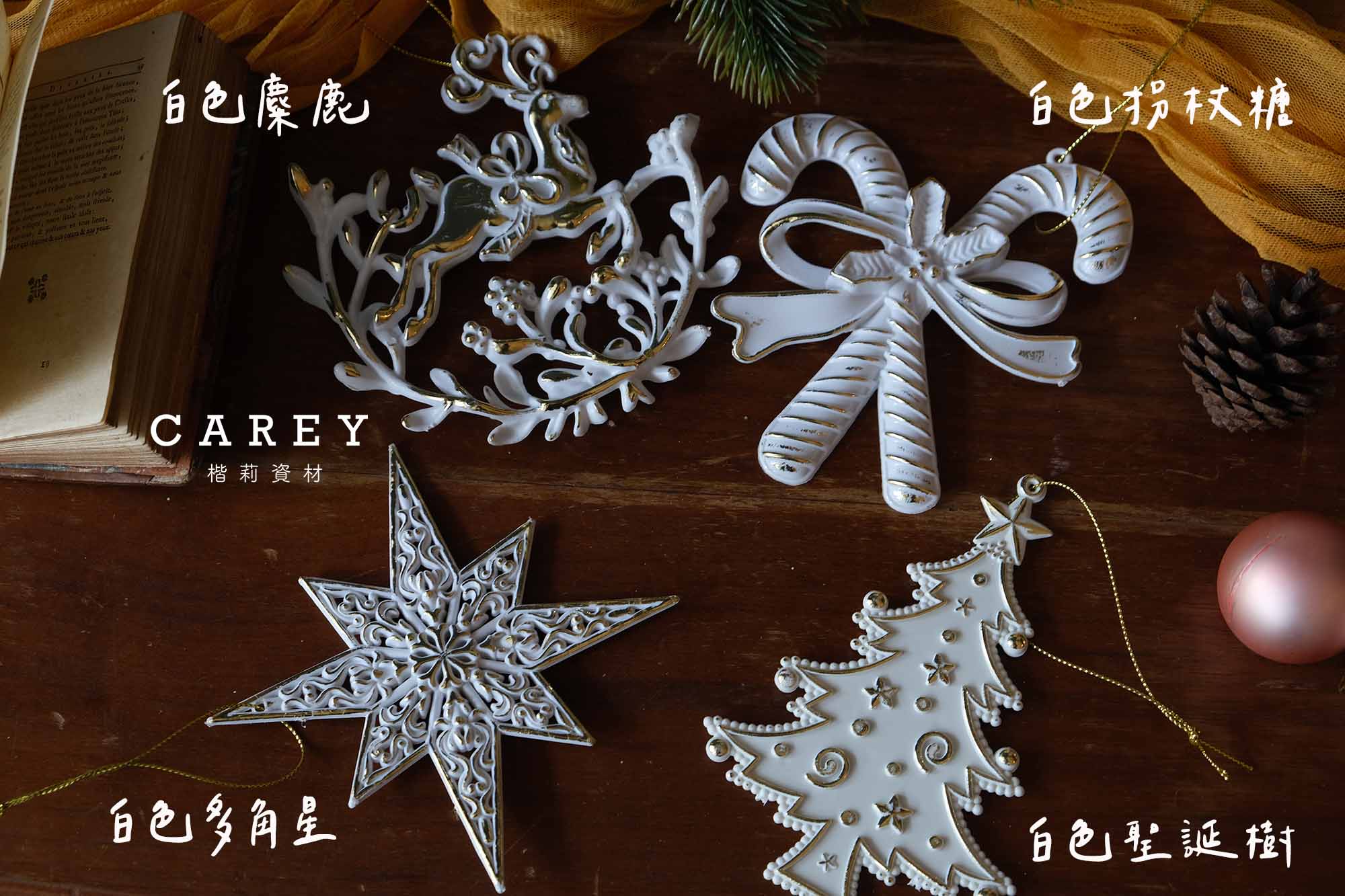 款式A.白色麋鹿, 款式B.白色拐杖糖, 款式C.白色聖誕樹, 款式D.白色多角星, 款式E:白色金邊獨角獸